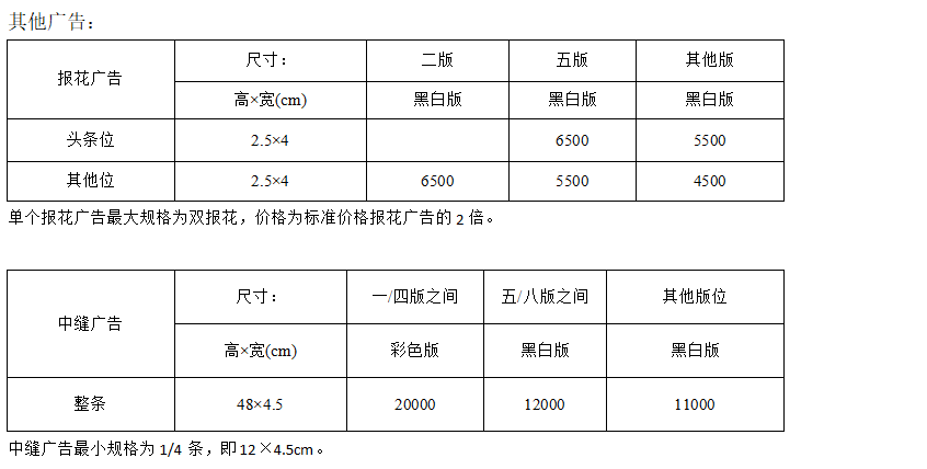 指定非广告版加收10000元,指定版位加收5000元;三天内加急加收广告价格的20%。