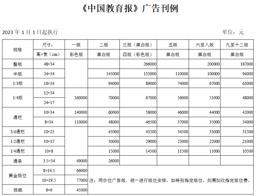 ◆ 除一、四版外,其他版面全国套彩加收30000元;全国套红加收8000元;