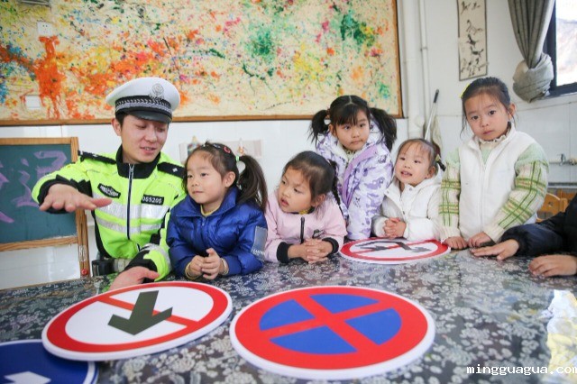 民警向小朋友展示、讲解交通标识和交通出行知识。通讯员 徐慧 摄
