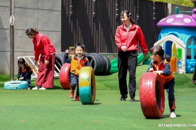 在福建省福州市鼓楼区水部街道博仕堡幼儿园,老师正在照护幼儿进行滚轮胎游戏活动。通讯员 谢贵明 摄