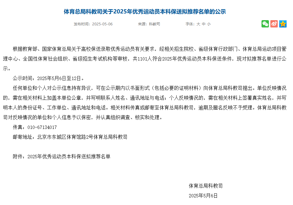 根据教育部、国家体育总局关于高校保送录取优秀运动员有关要求,经相关招生院校、省级体育行政部门、体育总局运动项目管理中心、全国性体育社会组织、省级招生考试机构等审核,共1101人符合2025年优秀运动员本科保送条件,现对拟推荐名单进行公示。