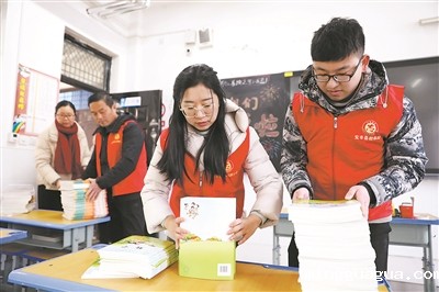 1月30日,在河南省宝丰县山河路小学,教师在清点教材。新学期开学临近,各地书店、学校积极做好教材和教辅资料的清点、搬运、分发等工作,为开学做好准备。何五昌 摄(新华社发)