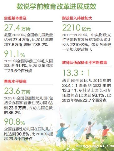 据教育部基础教育司负责人介绍,目前,学前教育实现基本普及。截至2023年,全国幼儿园数量达到27.4万所,比2013年增加7.6万所,增长了38.2%。学前三年毛入园率持续快速提高。2023年全国学前三年毛入园率达到91.1%,比2013年提高了23.6个百分点。区域差距不断缩小。从2013年到2023年,学前三年毛入园率增长幅度超过20个百分点的17个省份都在中西部,四川凉山州雷波县入园率达到90%以上,青海果洛州达日县、玛多县入园率均达到80%以上,“三区三州”等脱贫攻坚地区、民族地区幼儿均和其他地区孩子一样享有平等的入园机会。