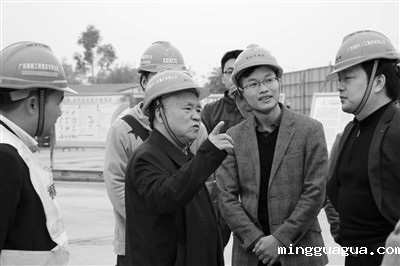 中国工程院院士、广西大学土木建筑工程学院教授郑皆连(左一)在桥梁建设现场指导工作。广西大学 供图
