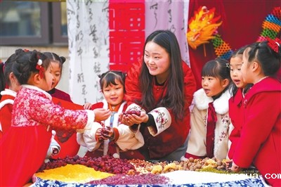 1月3日,浙江省湖州市德清县武康街道千秋幼儿园开展“萌娃学民俗 开心迎腊八”活动,小朋友通过认食材、做腊八粥、印福字等民俗活动,感受中华优秀传统文化的独特魅力,迎接腊八的到来。 王正 摄