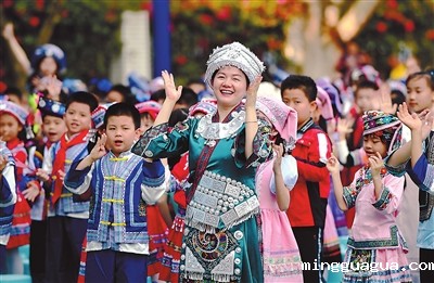 3月27日,在广西南宁市滨湖路小学,师生载歌载舞。