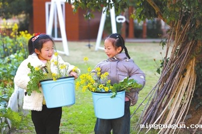日前,浙江省诸暨市暨南街道街亭幼儿园的孩子们来到种植园地,在教师的指导下观察青菜花、采摘萝卜,体验劳作的乐趣和艰辛。图为孩子们喜悦地捧着劳动果实。