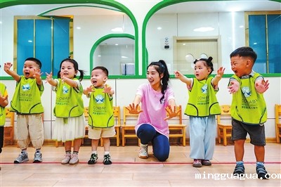 图③ 近日,在安徽省芜湖市繁昌区繁阳镇新爱婴托育服务中心,小朋友在教师的照护下玩游戏。 肖本祥 摄