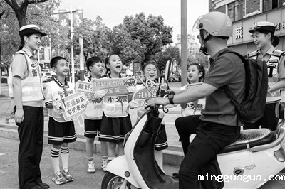 8月13日,在安徽省芜湖市繁昌区繁阳镇五华山路口,“小交警”在交警的带领下向市民宣传交通安全知识。肖本祥 摄